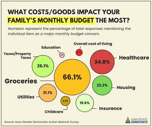 We know Iowans are feeling the squeeze as household budgets get tighter. That’s why we’ve made lowering costs and making life more affordable for working families our main priority going forward. So, we asked: What costs/goods impact your family’s monthly budget the most?